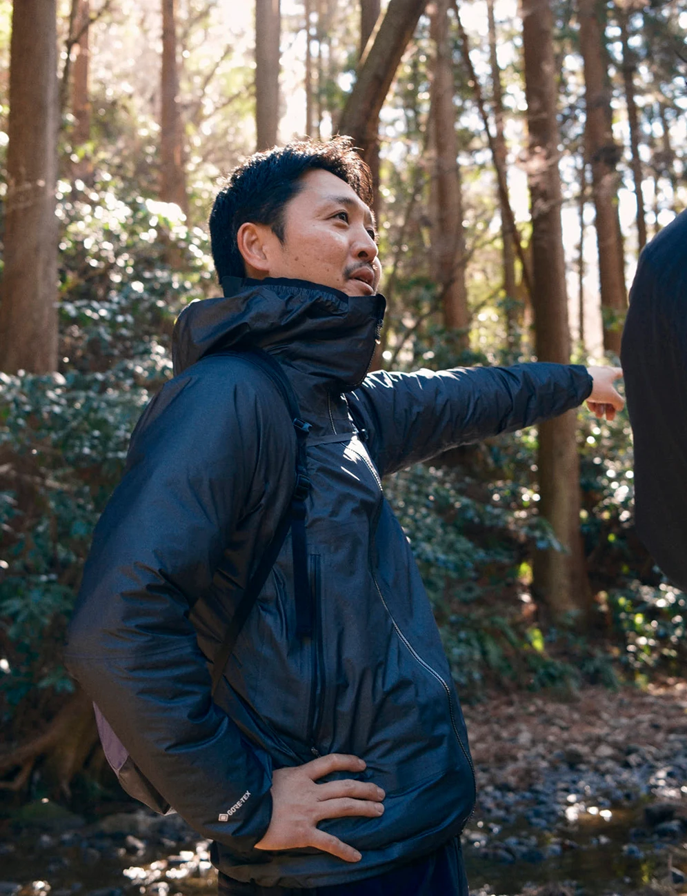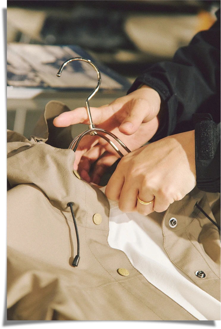 神山が主に担当しているのはライフスタイルのカテゴリー。おすすめの新作を尋ねると、フェスやアウトドアシーンだけじゃなく、シティにも馴染むレインコートをピックアップしてくれた。