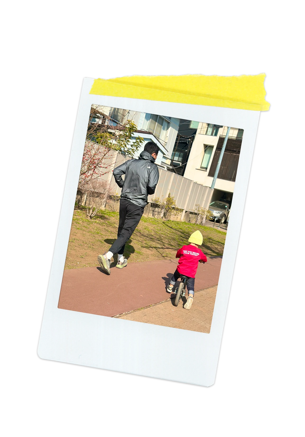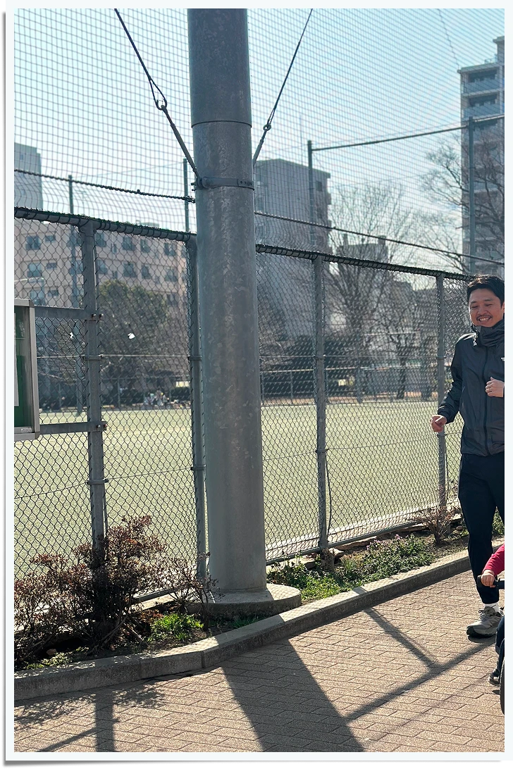 The North Faceのニットキャップをかぶった息子と一緒に、近所の公園でゆっくり走る時間はとても穏やか。いつか一緒にサッカーをする日を夢見ている。