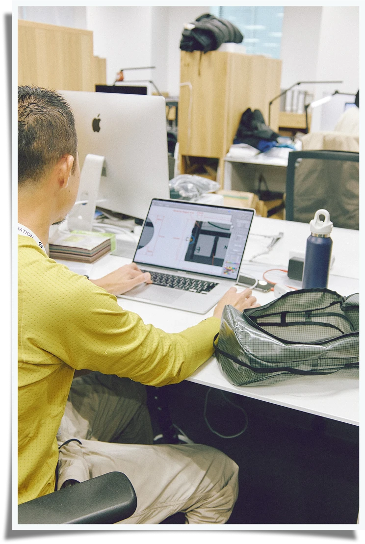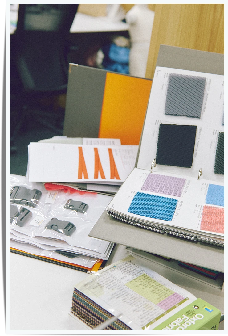 トレイルランが趣味の田嶌は、所作に無駄がなくランナーのムードが漂う。PCやタブレットでデザインし、生地からファスナー、バックルなどのパーツまで、機能性や耐久性などを考慮しながら素材を選んでいく。「フィッティングに大きく影響するショルダーハーネスなどは、展開図を紙にプリントアウトして検証することも。サンプルが上がってきたら修正点を検討し、海外の工場や富山のチームと協力しつつサンプルの完成度を高めていきます」。通勤バッグは自身がデザインしたサンプルをテストとして使うのがお決まり。「日常使いすることで、見えてくるものもあります。電車に乗る時も走っている時も、結果、24時間デザインのことを考えていますね(笑)」。そんな田嶌が大切にしているのは、“正しいよりも楽しく”という恩師からの言葉。「正しさは状況によって変わりますが、楽しいのはそれだけで価値のあること。自分が軸となり、まわりを巻き込んで楽しい雰囲気を作れる人間でありたいですね」