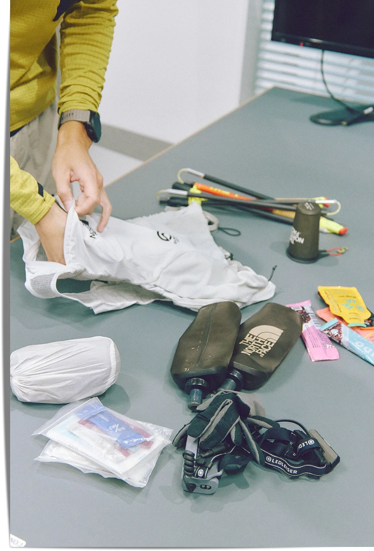 実際のトレイルランレースを想定した荷物をサンプルに入れて検証。使用の工程で引っかかりなど違和感がないかを入念にチェック。