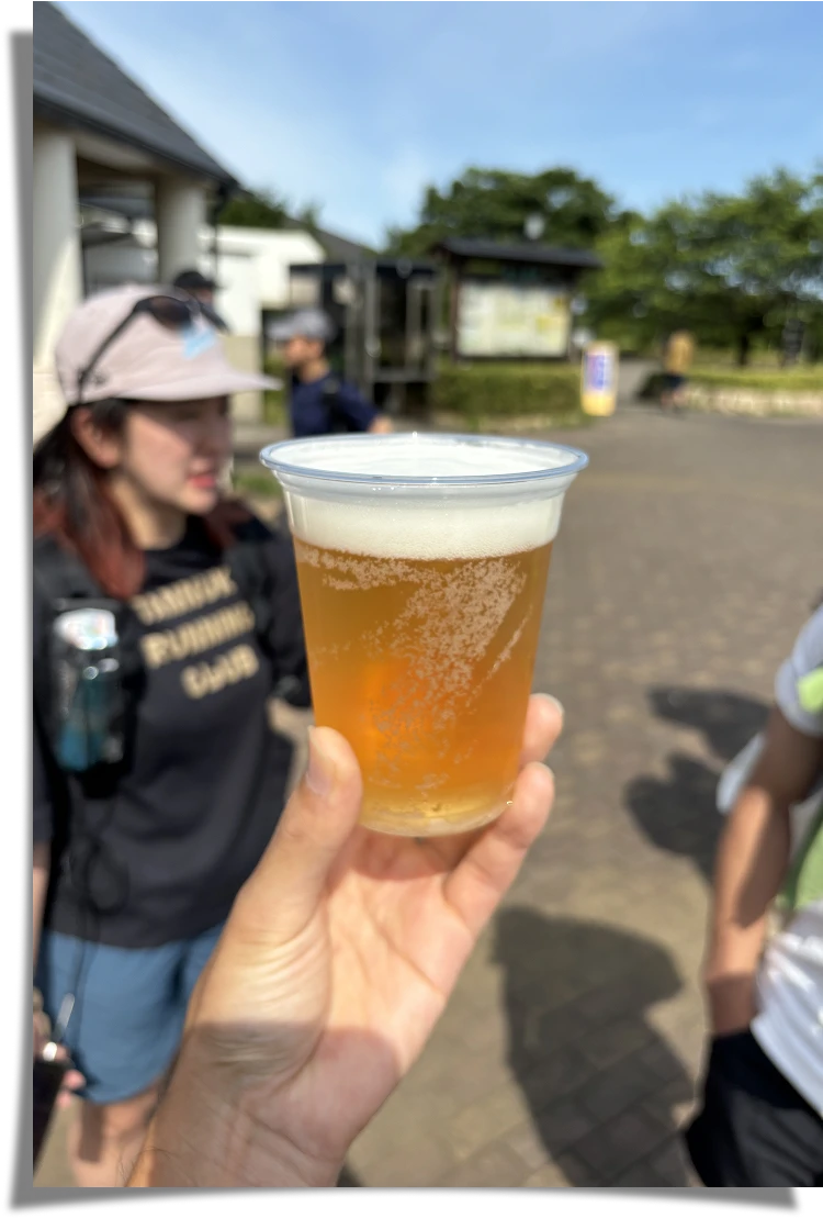 ランニングチームでの練習のひとコマ。退勤後に皇居あたりを走る。走ったあとのビールも欠かせない。