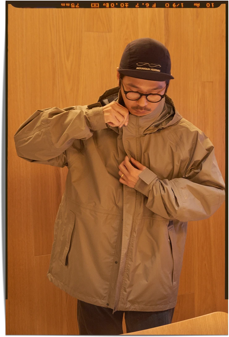 入社前から毎年のように野外音楽フェスに通っていたという、音楽とアウトドアが好きな飯島。現在はアパレル事業部のMDとして、主にThe North Faceがアウトドアで培ってきた機能性を都市向けのデザインに落とし込んだ「Urban Exploration」部門を担当。1年半前から同チームに加わった頼もしい後輩・奈良とのタッグで、本国との会議や工場視察など、全国各地を飛び回っている。「最近ローンチされたこの〈Compile Light Jacket〉は、雨天の登山用に作られた〈Climb Light Jacket〉と同素材を採用。サンプルチェック時は、僕の体型がマスターサイズのLくらいなので、まずは自分が着てみてサイズ感を確かめています。通常レインウェアって平滑な表面が多いのですが、このアイテムはGORE-TEXの3層生地に、熱を加えた特殊な技術でパッカリング(縫い目の間にできるシワ)を実現しました。ニュアンスが加わったデザインで、よりファッション感度の高い人へも提案できます」
